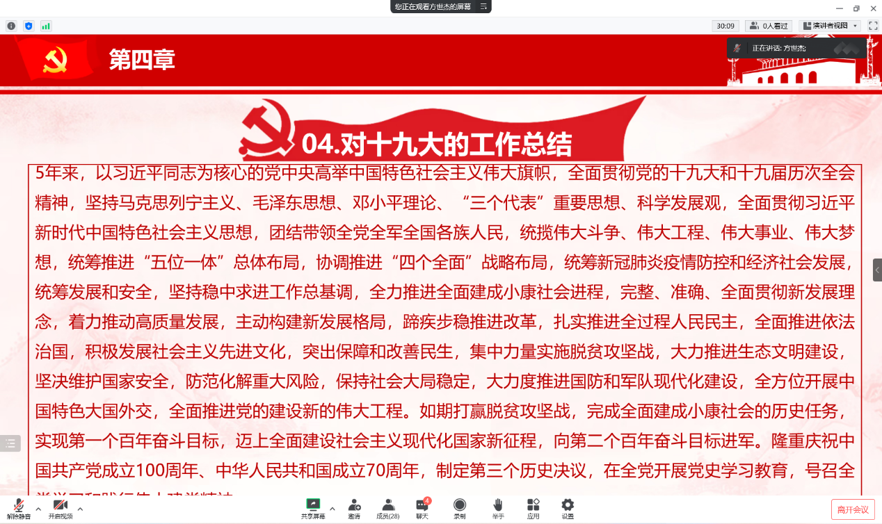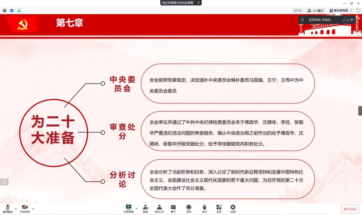 会议伊始,方世杰遵循幻灯片的目录为我们一一讲述,重点阐述了党的十九届六中全会以来中央政治局的工作,总结十九大以来全面贯彻习近平新时代中国特色社会主义思想,全力推进全面建成小康社会新征程的奋斗历程,分析当前局势,确定当前任务,深入讨论了新时代新征程坚持发展中国特色社会主义、全面建设社会主义现代化国家的若干重大问题,同时确立习近平同志的领导核心地位以及学习宣传贯彻党的二十大精神。